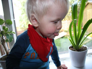 Smekkurinn algjörlega í anda kreppukynslóðarinnar, sem Unnar Freyr er partur af. Rauða efnið var bómullar bolur sem pabbi hans átti og limegræna flísið aftaná voru afgangar sem ég hélt að væru í einskis nýttir. Endurvinnsla enn eina ferðina. Það er liggur við skemmtilegra að sauma þannig heldur en úr keyptum efnum!Er hann ekki bara sætastur, snúðurinn minn?
